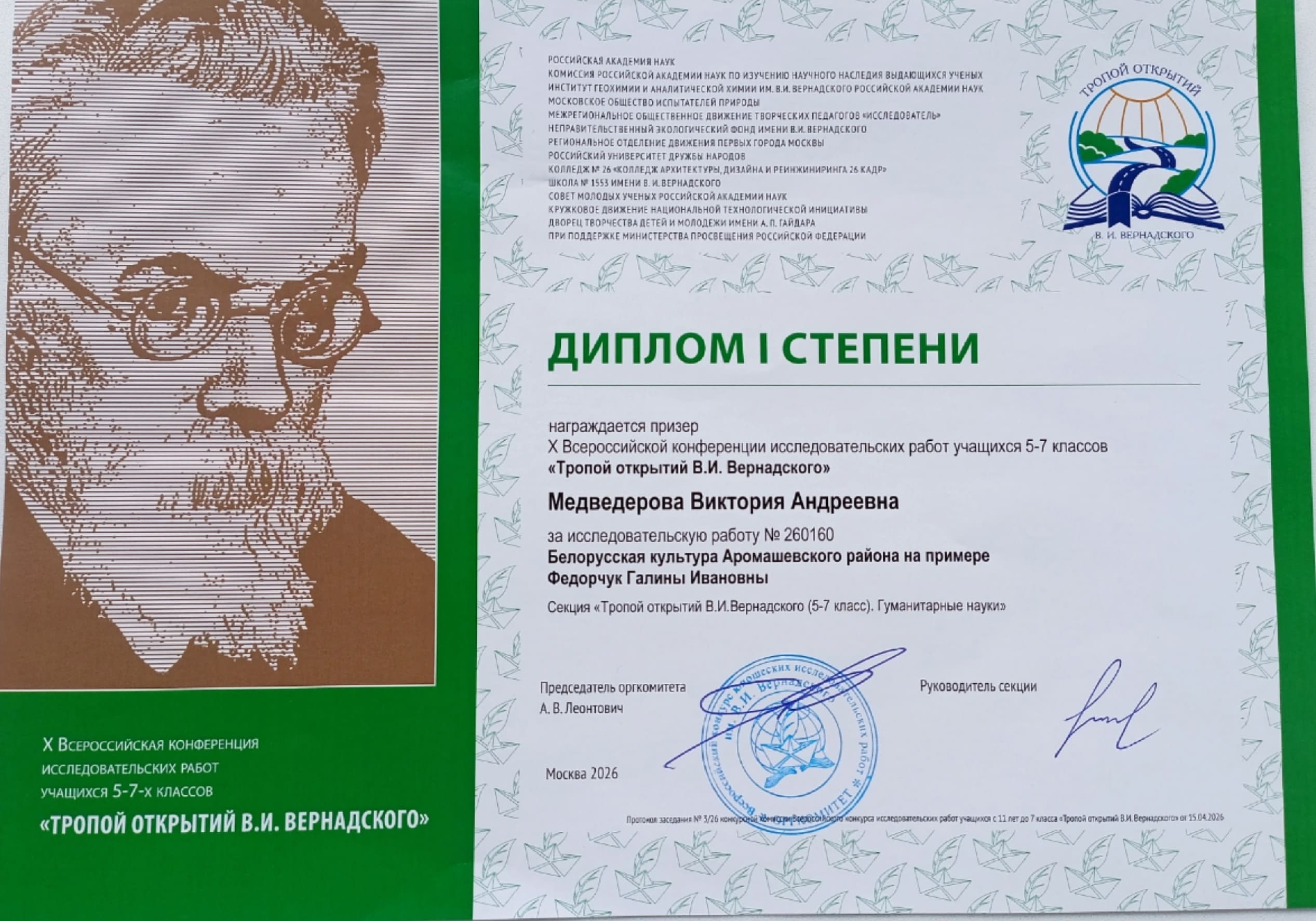 С 13 по 17 апреля в Москве, в Президиуме Российской академии наук, прошла XXXIII Всероссийская конференция исследовательских работ школьников 5–7 классов «Тропой открытий В. И. Вернадского». От Тюменской области в конкурсе участвовала Виктория Медведерова из Дома детского творчества. Её работа была посвящена белорусской культуре Аромашевского района на примере Галины Ивановны Ситдиковой. Руководила проектом Наталья Николаевна Медведерова. В своей возрастной группе и номинации Виктория заняла первое место. Более 570 исследовательских проектов представили ученики из 68 регионов России, а также из Белоруссии, Казахстана, Кыргызстана и других стран. Программа конференции была насыщенной, и дети успели посетить множество экскурсий по Москве.